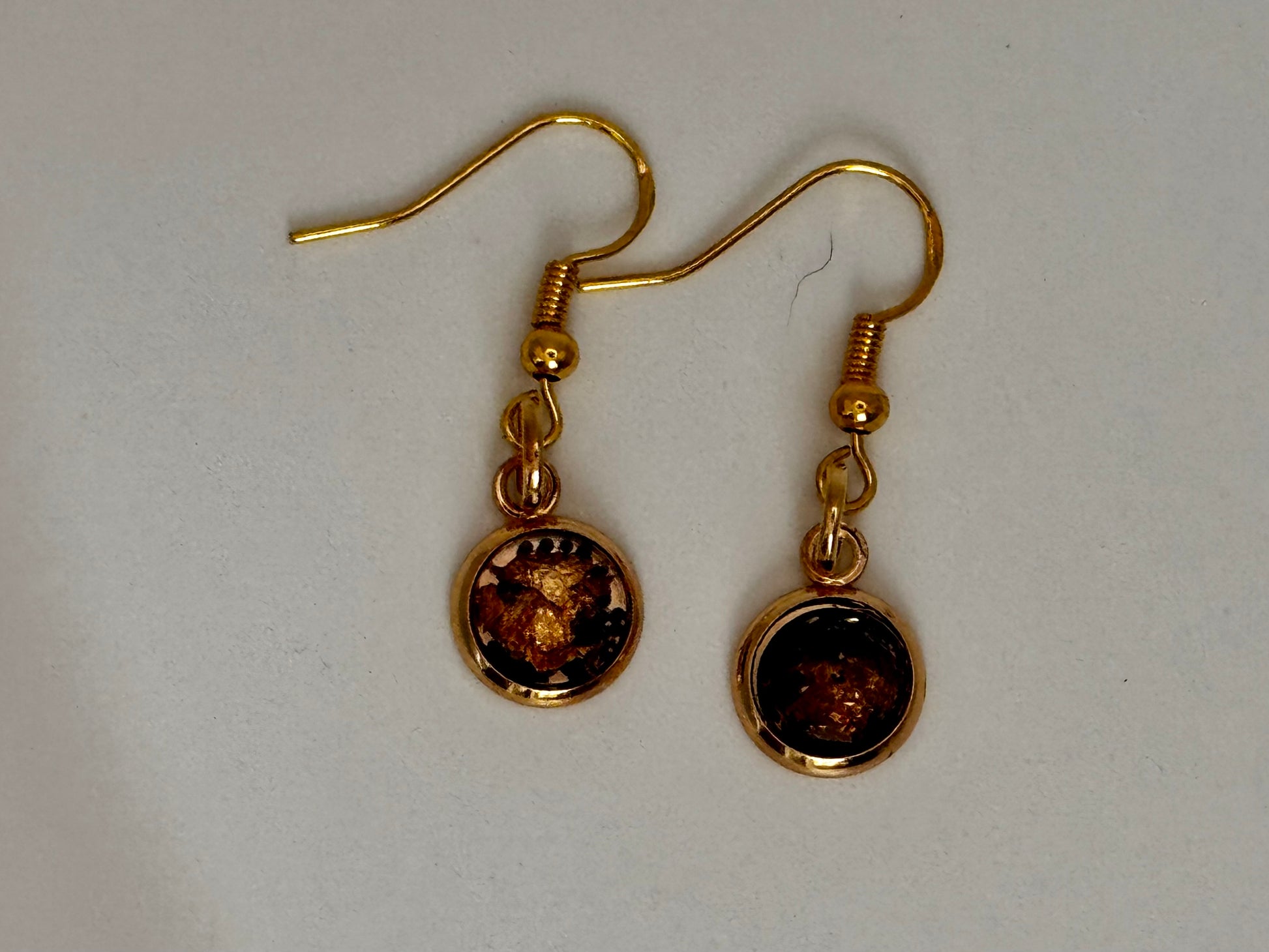 These dangle earrings are small but bold. They host gold flakes in a black background. Earring backs are gold-plated stainless steel.