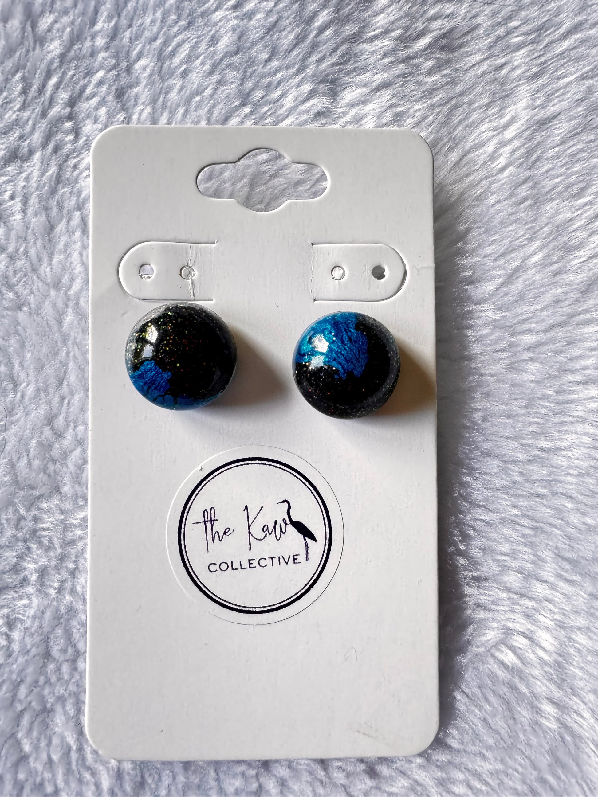 Beautiful stud earrings with blue, black and bronze and a hint of glitter shimmer.
