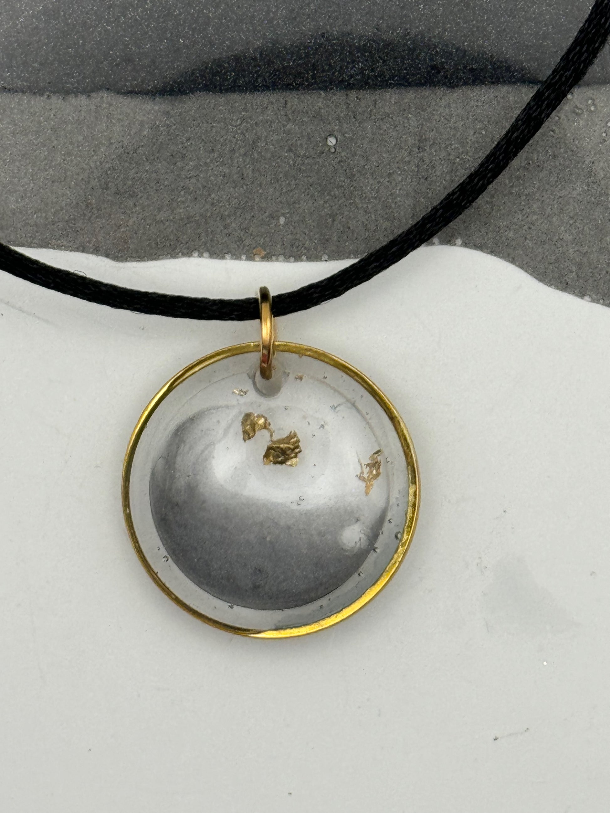 Introducing the Black and Gold Circle Pendant—a striking geometric piece that combines sleek modern design with organic charm. This circled pendant features a gradient from deep charcoal to soft white, accented by a touch of radiant gold leaf. Lightweight and versatile, it hangs from a black cord with a gold-tone loop for added elegance. Perfect for those who love minimalist jewelry with a hint of luxury.