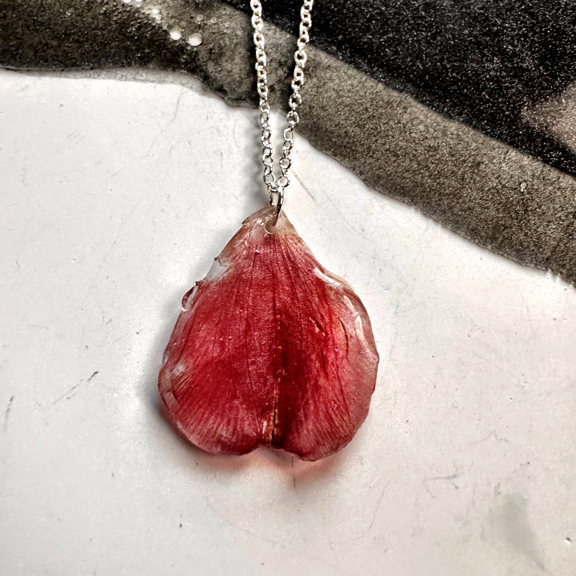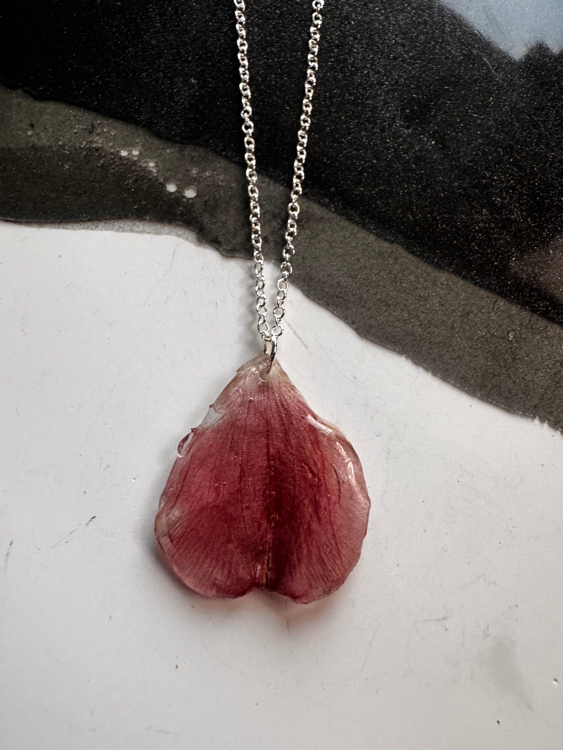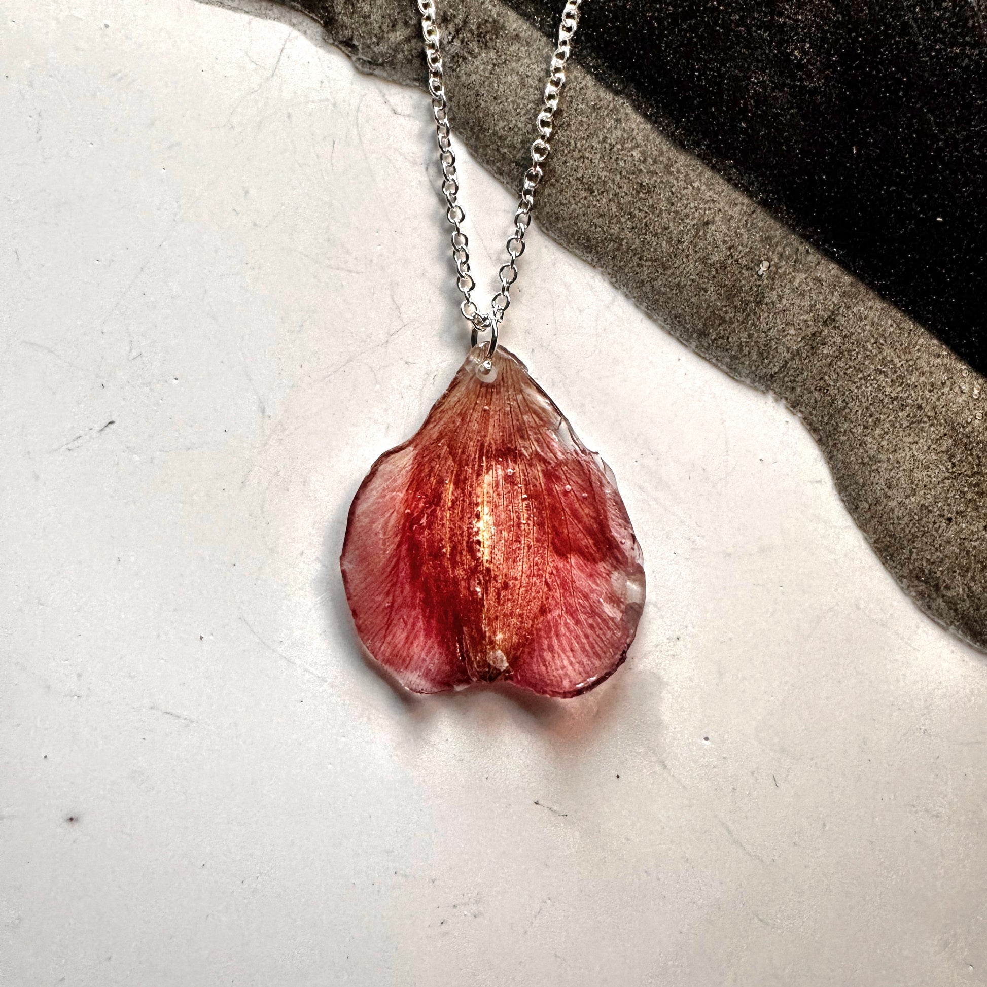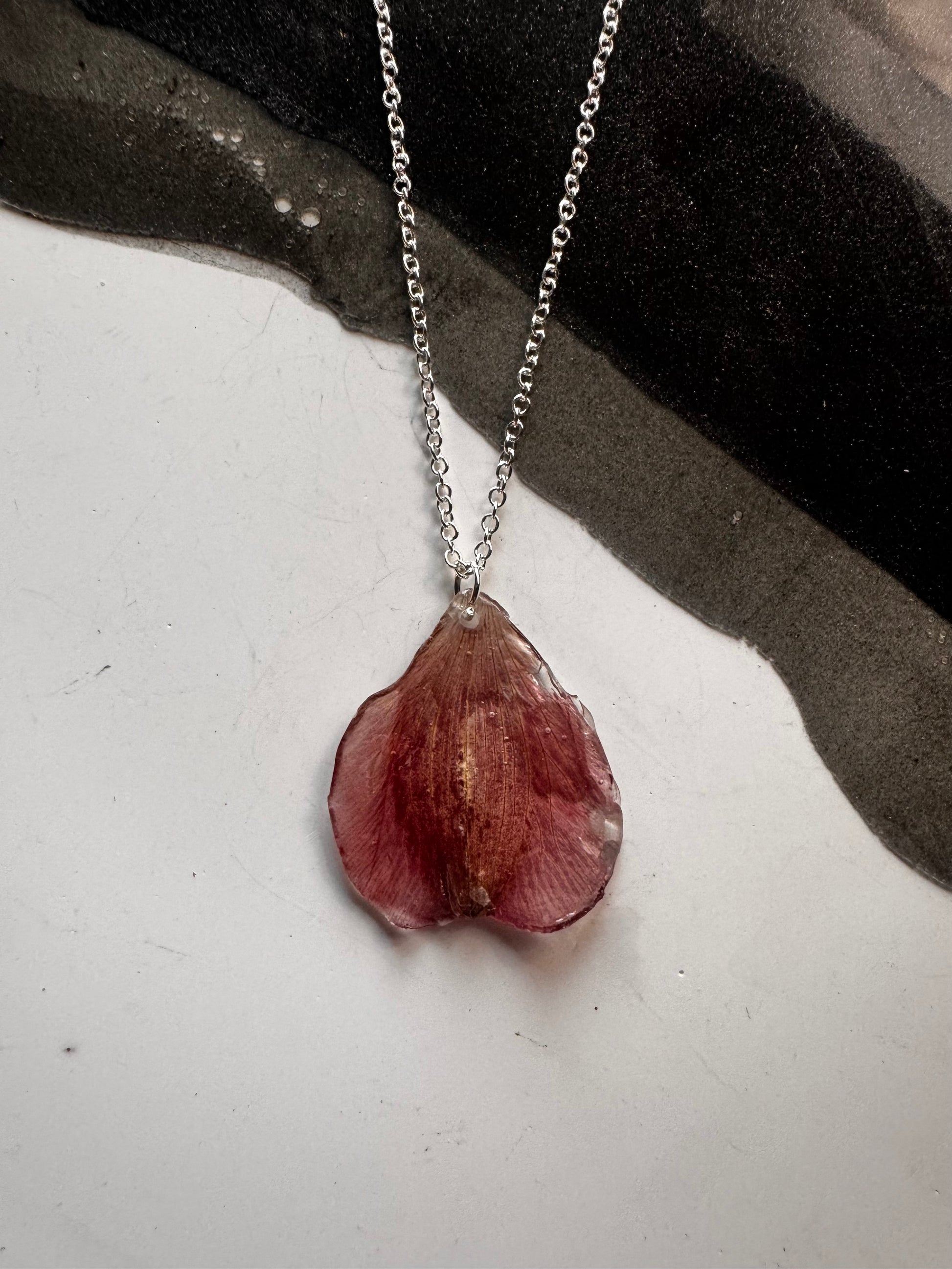 The Eternal Iris Petal Pendant captures the timeless elegance of a single rose petal, preserved in resin and suspended from a golden chain. Its light mauve and pink hues fades gently to a warm golden tip, symbolizing love, passion, and beauty that endures. Minimal yet striking, this pendant is a wearable keepsake of nature’s most romantic bloom—perfect for anniversaries, heartfelt gifts, or as a daily reminder of love’s enduring presence.