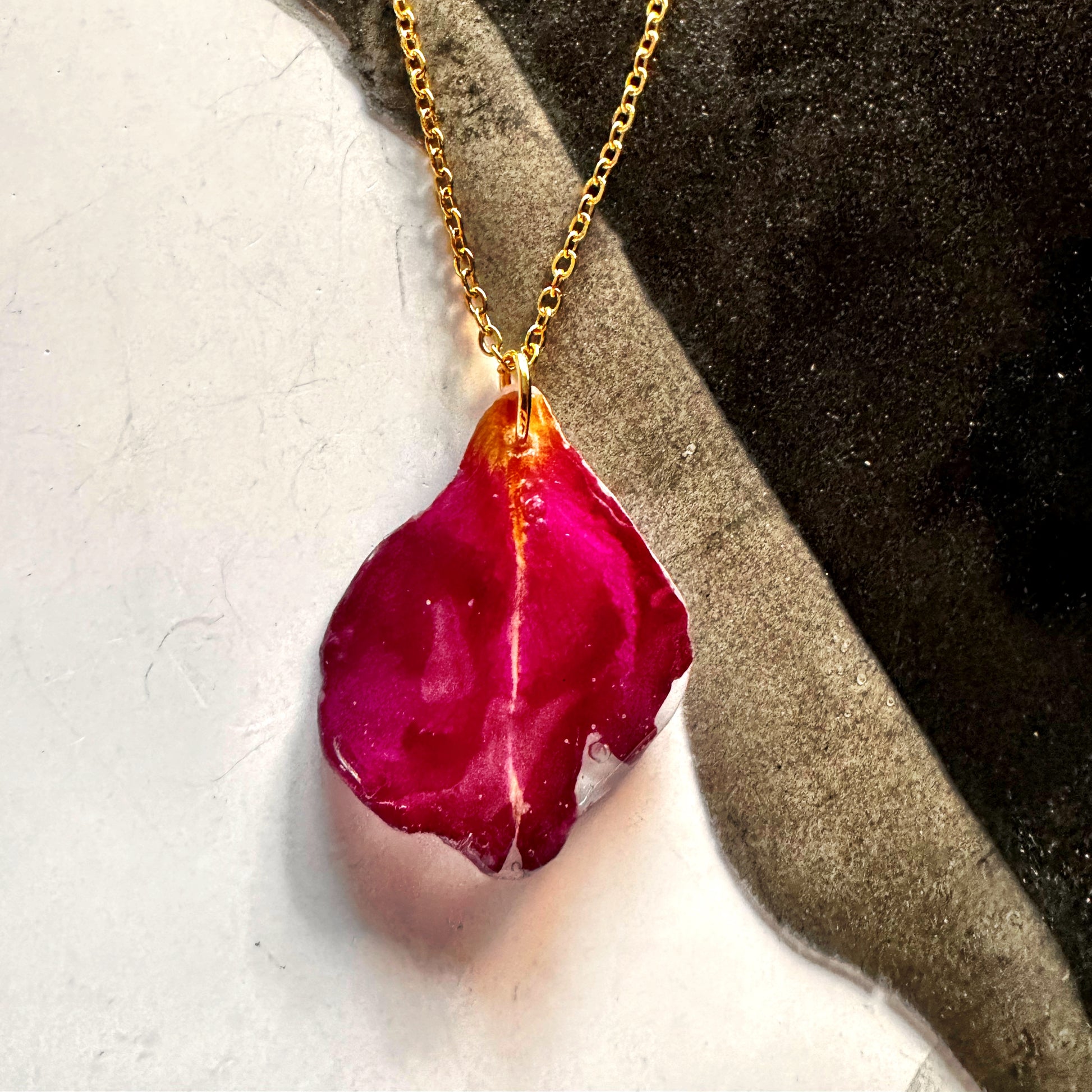 The Eternal Rose Petal Pendant captures the timeless elegance of a single rose petal, preserved in resin and suspended from a golden chain. Its rich magenta hue fades gently to a warm golden tip, symbolizing love, passion, and beauty that endures. Minimal yet striking, this pendant is a wearable keepsake of nature’s most romantic bloom—perfect for anniversaries, heartfelt gifts, or as a daily reminder of love’s enduring presence.