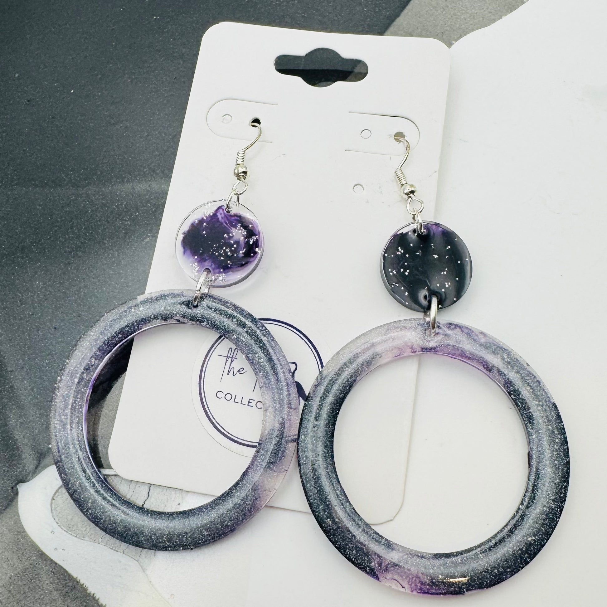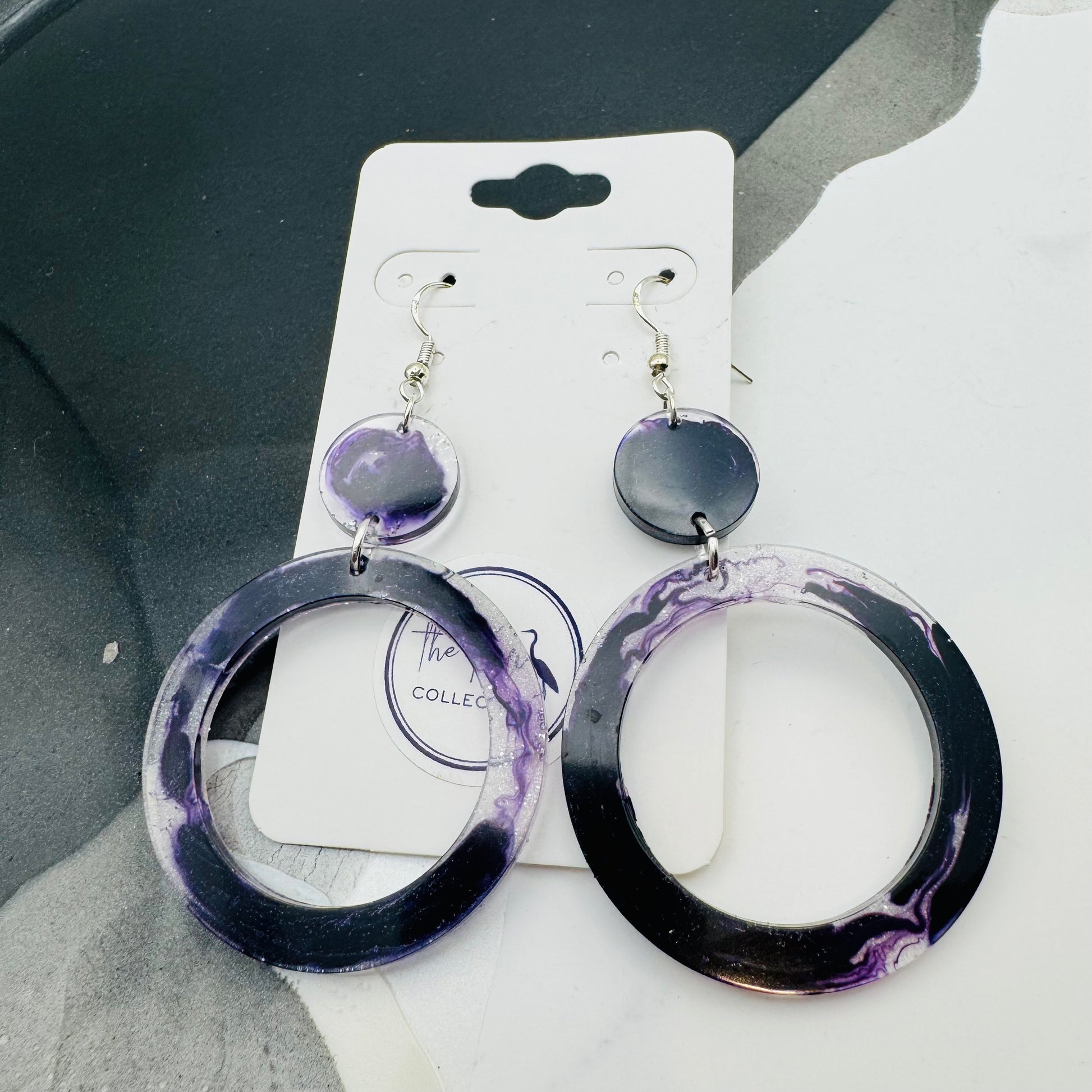 The Violet Swirl Hoops from the Dash Collection bring a touch of moody elegance with their dramatic blend of deep and swirling violet hues. These bold circular earrings are accented with a subtle marbled effect, giving them a sense of fluid motion and cosmic intrigue.
