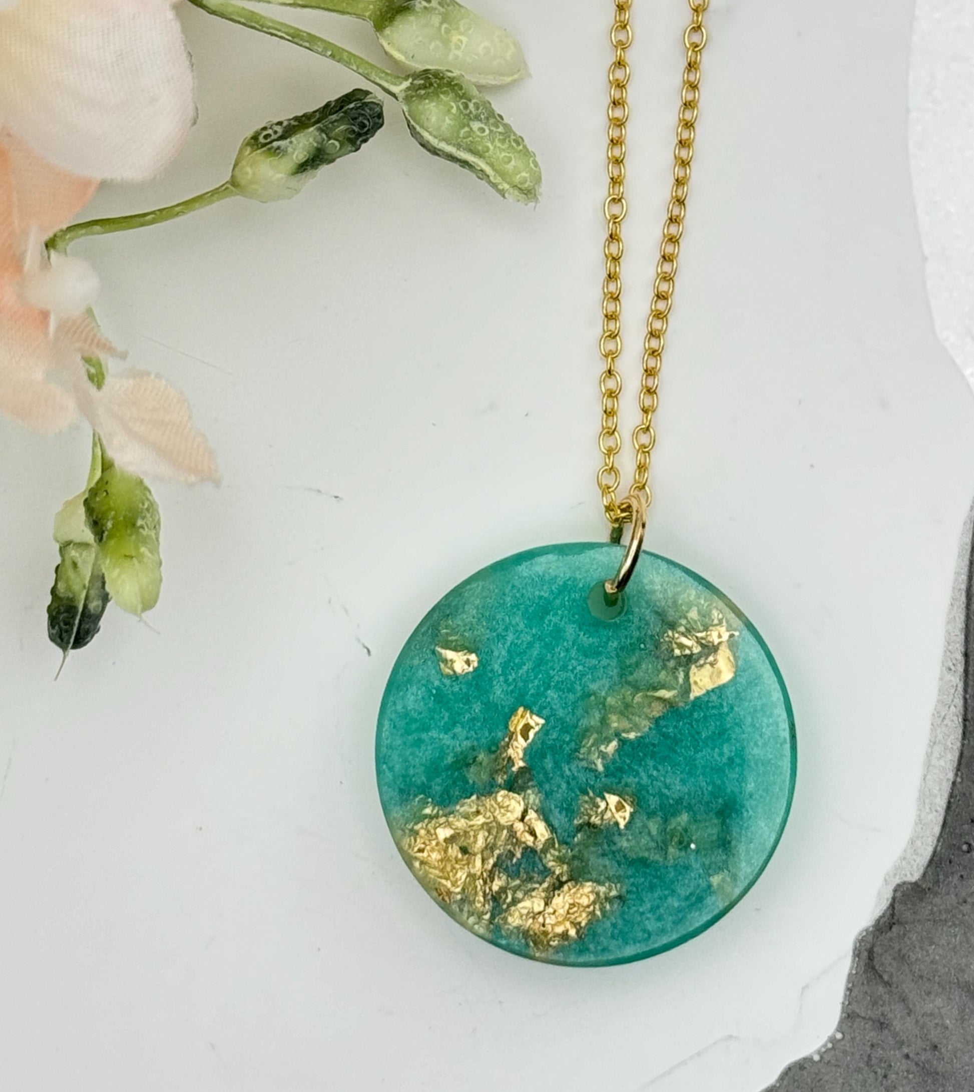 This captivating round pendant combines a lush green backdrop with glimmers of gold leaf, evoking the beauty of untouched landscapes and hidden treasures. Suspended on a delicate gold chain, this piece celebrates the elegance of nature with a touch of glamour, perfect for any occasion.
