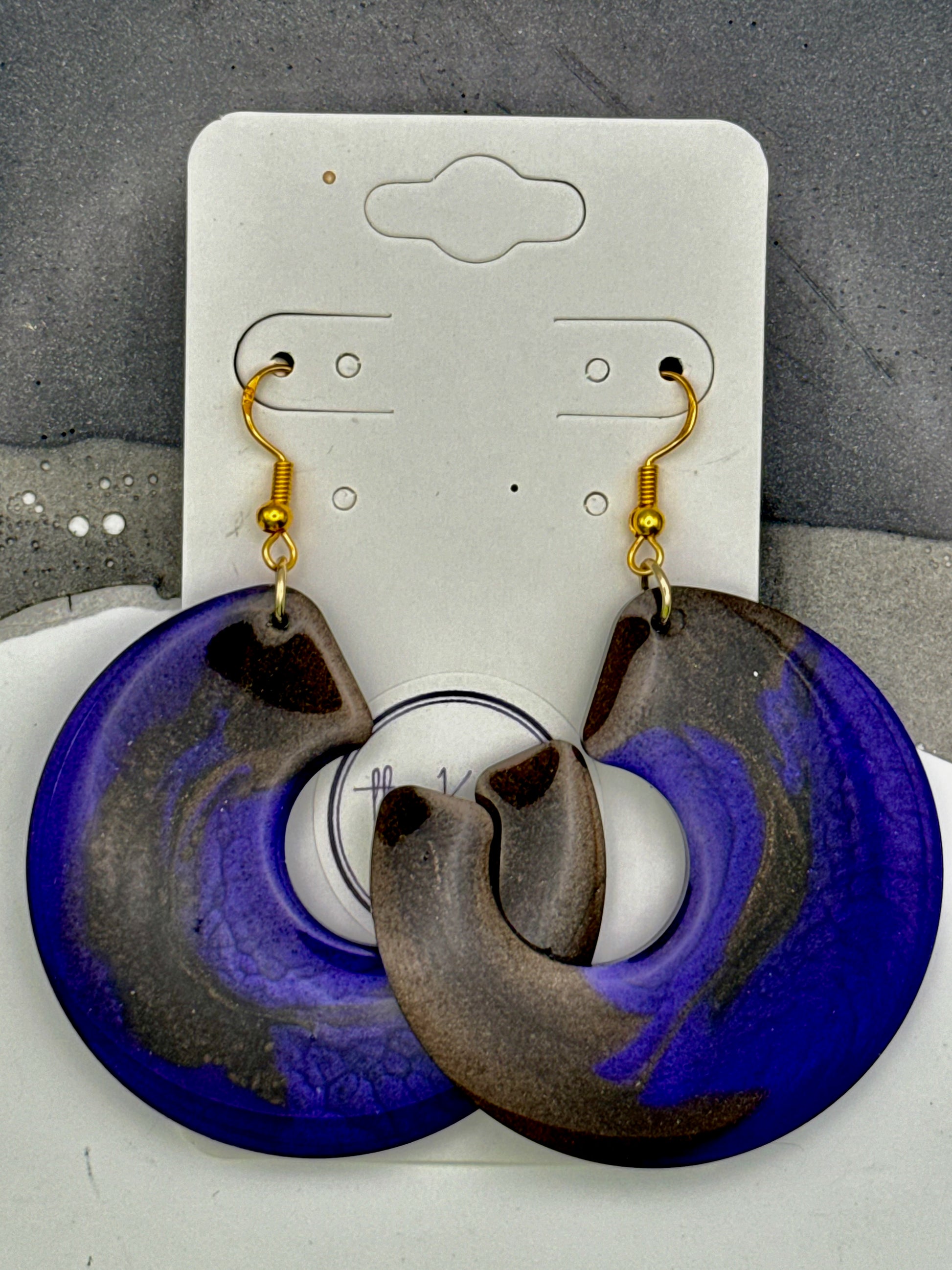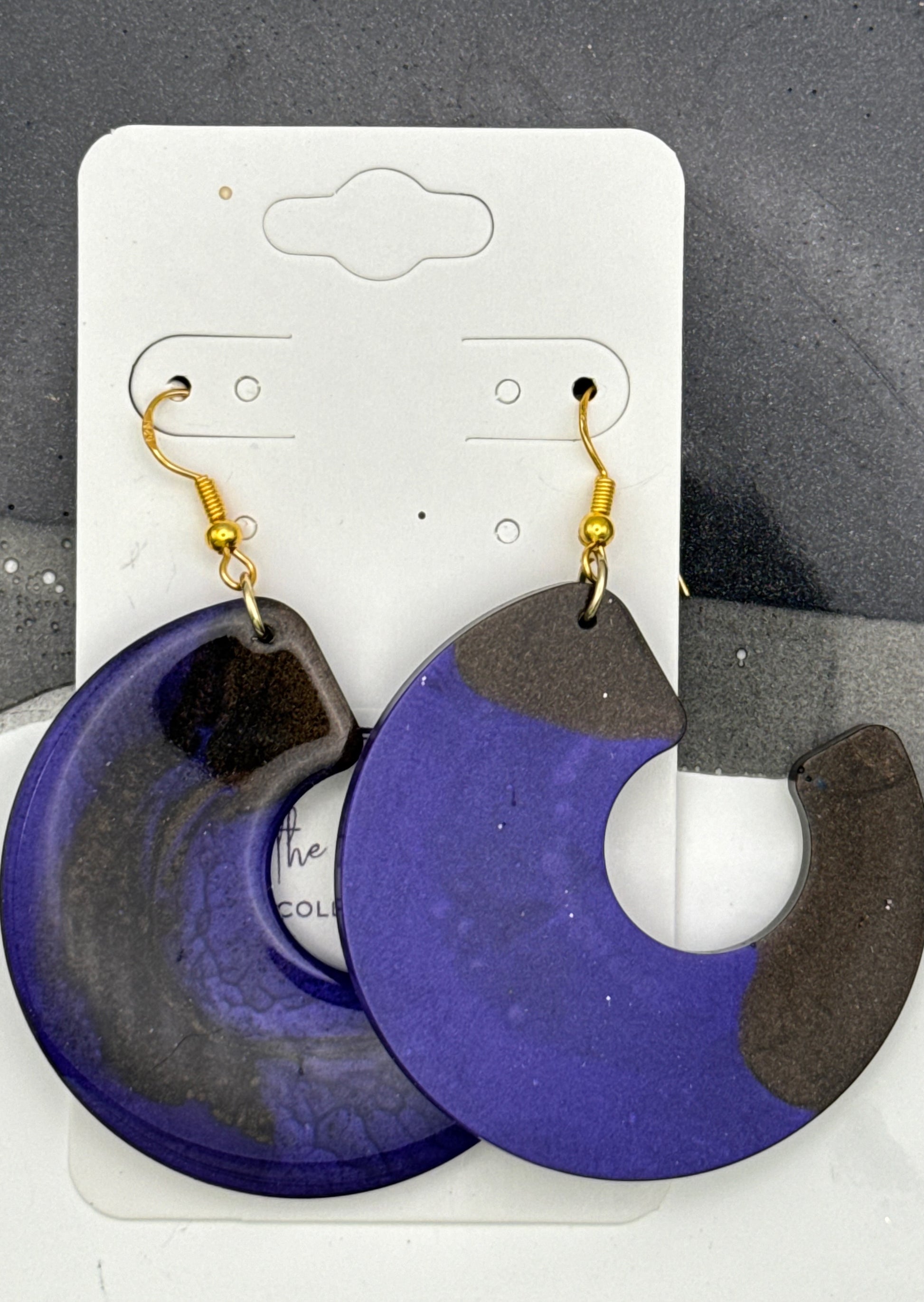 These striking crescent-shaped earrings feature a swirling mix of royal purple and bronze with subtle marbled details, reminiscent of team spirit in motion. Their unique cutout design adds an artistic edge, making them a statement piece for fans who love to stand out.