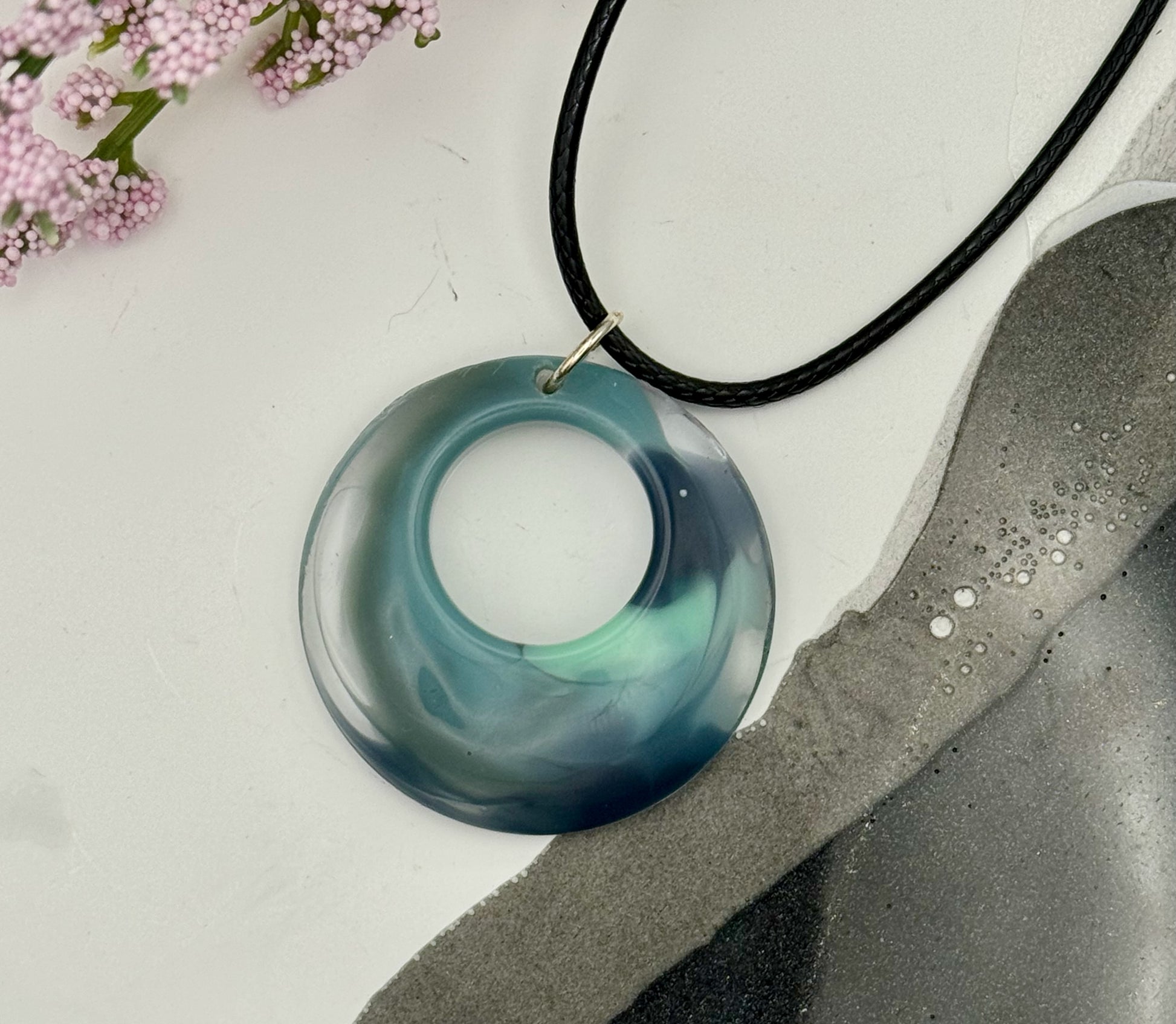 A stunning circular pendant with dreamy swirls of teal and gray, embodying the moody allure of quiet confidence. This piece from the Tell Me I'm Pretty Collection is perfect for those who appreciate understated beauty with a touch of intrigue. Wear it to captivate effortlessly, whether you're dressing up or keeping it casual.