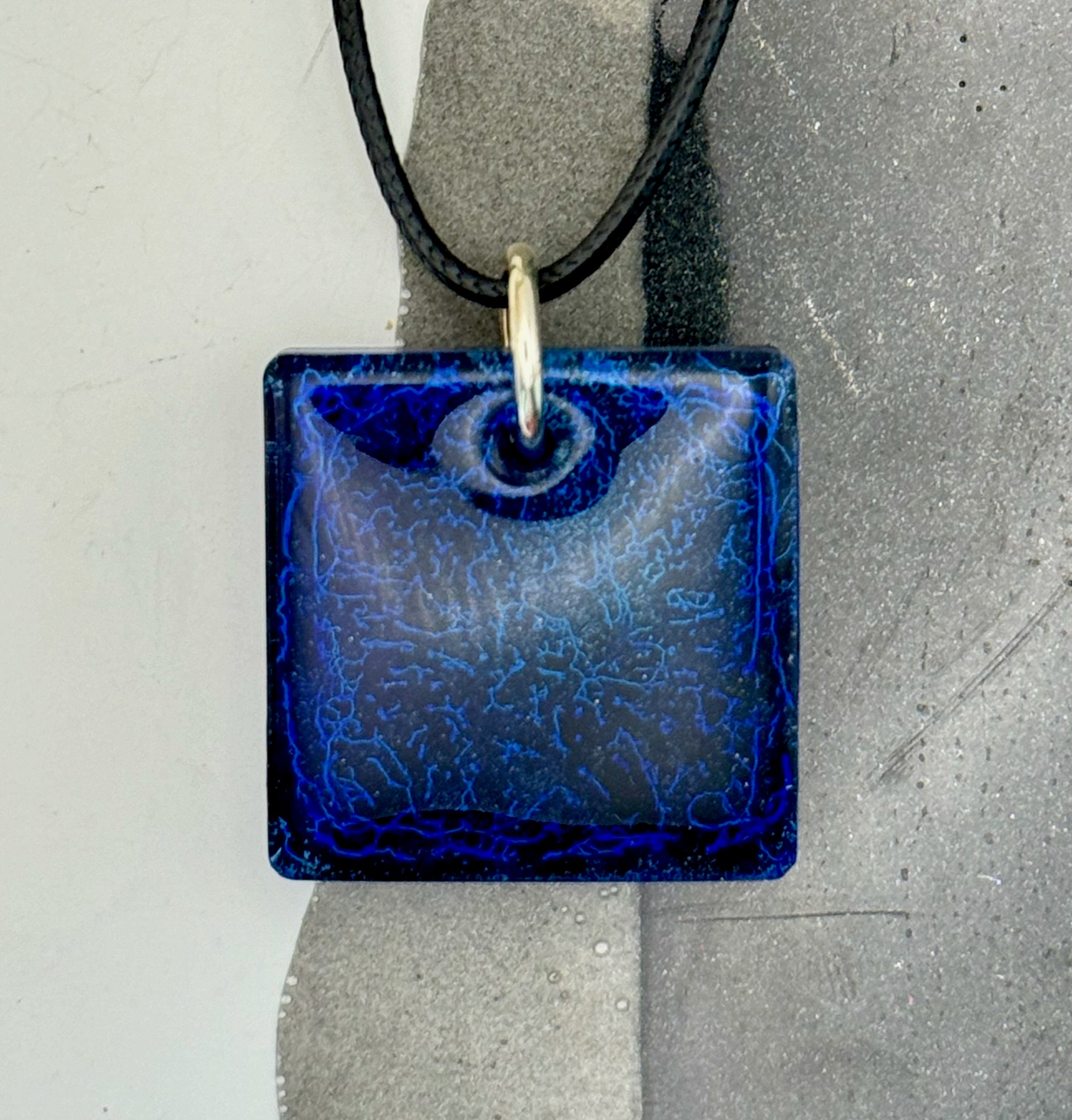 This bold square pendant from the Tell Me I'm Pretty Collection features deep blues and subtle crackled textures, giving it a striking and moody appeal. Perfect for making a statement with any outfit, this piece adds a touch of intrigue and sophistication. The pendant hangs on a sleek black cord, ensuring it remains the focal point of your look.