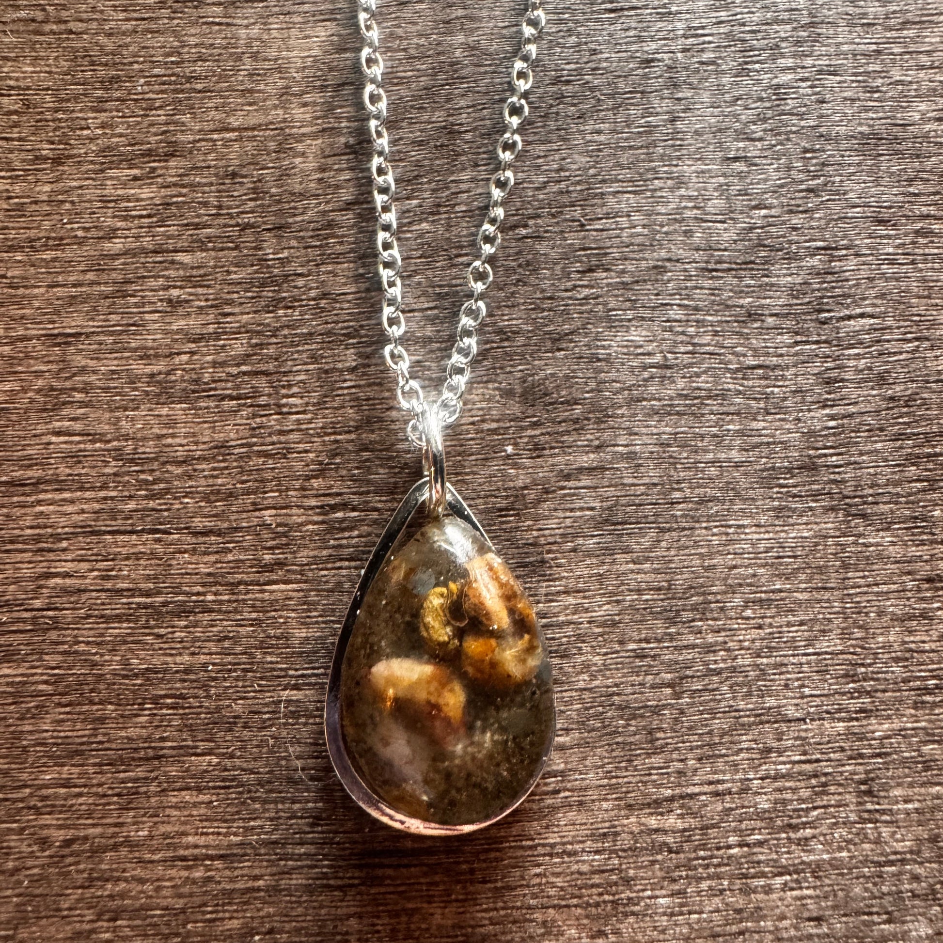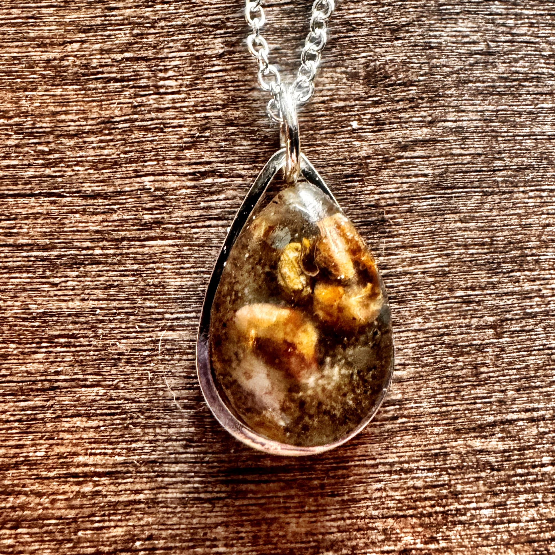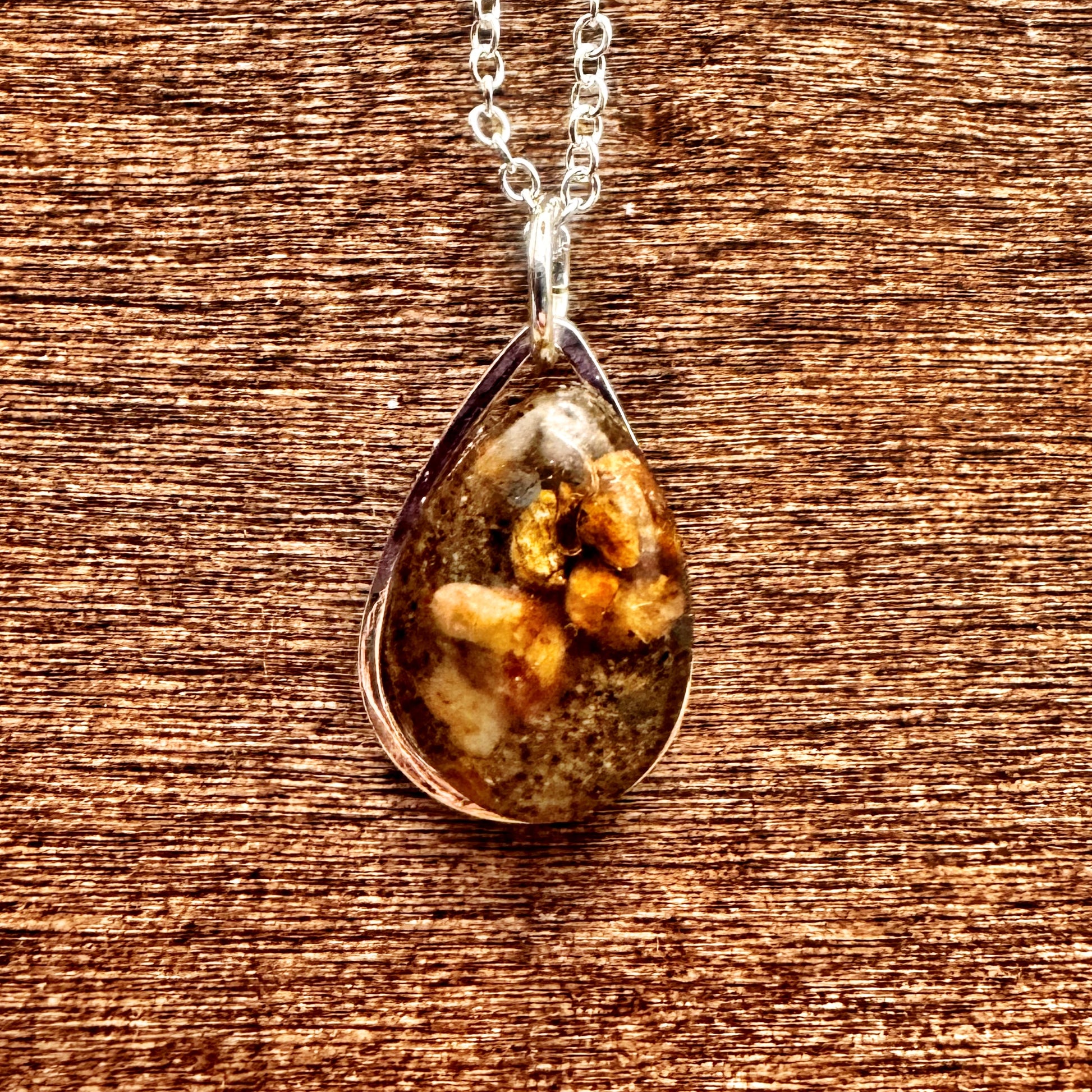 The Missouri River Keepsake Pendant holds a piece of nature’s story within its frame. Made with authentic pebbles and sand gathered from the banks of the Missouri River, this contemporary pendant captures the timeless flow and grounding energy of one of America’s greatest waterways. Each stone and grain is preserved in clear resin, creating a natural mosaic that is both earthy and elegant. A meaningful keepsake for adventurers, nature lovers, or anyone who carries the spirit of the river with them.