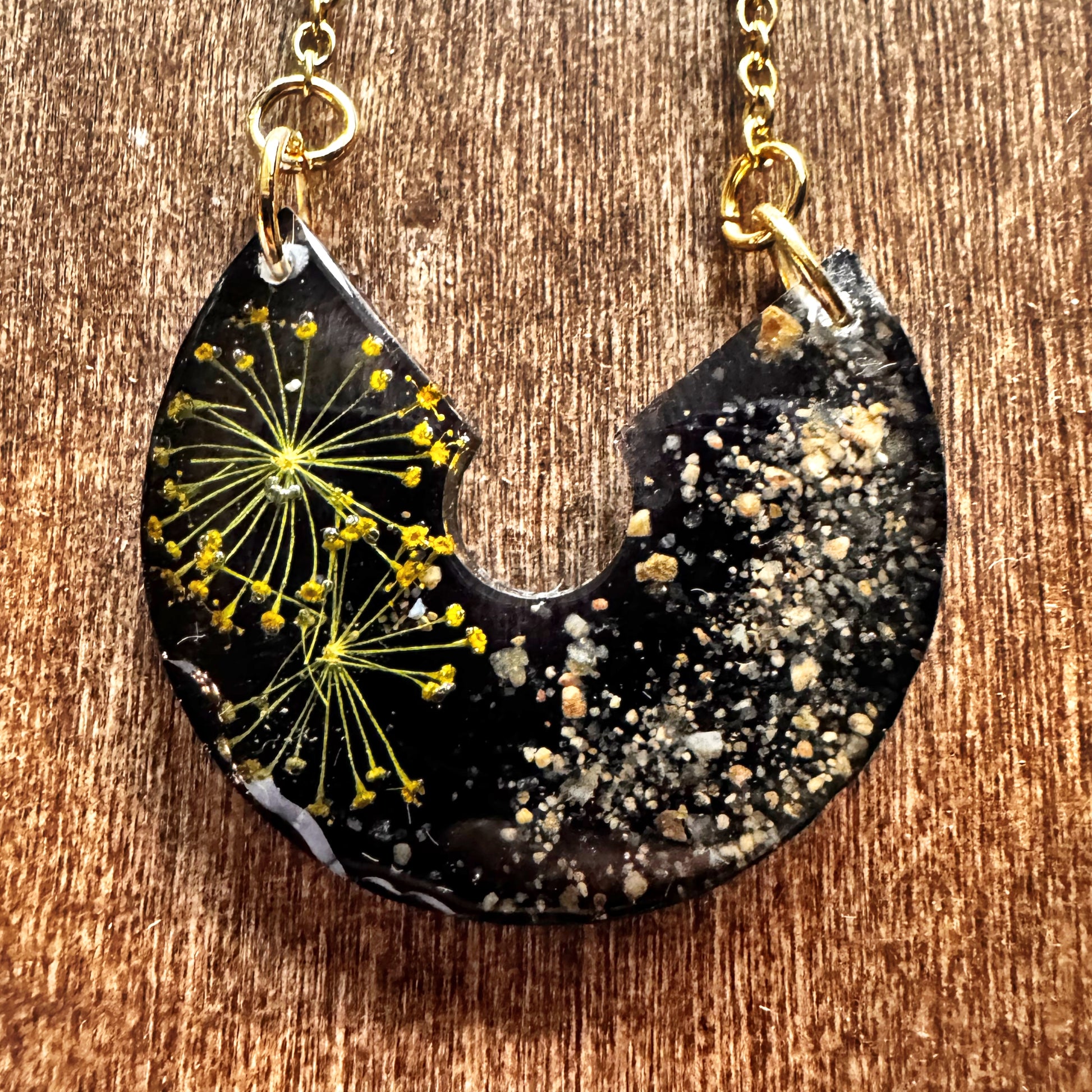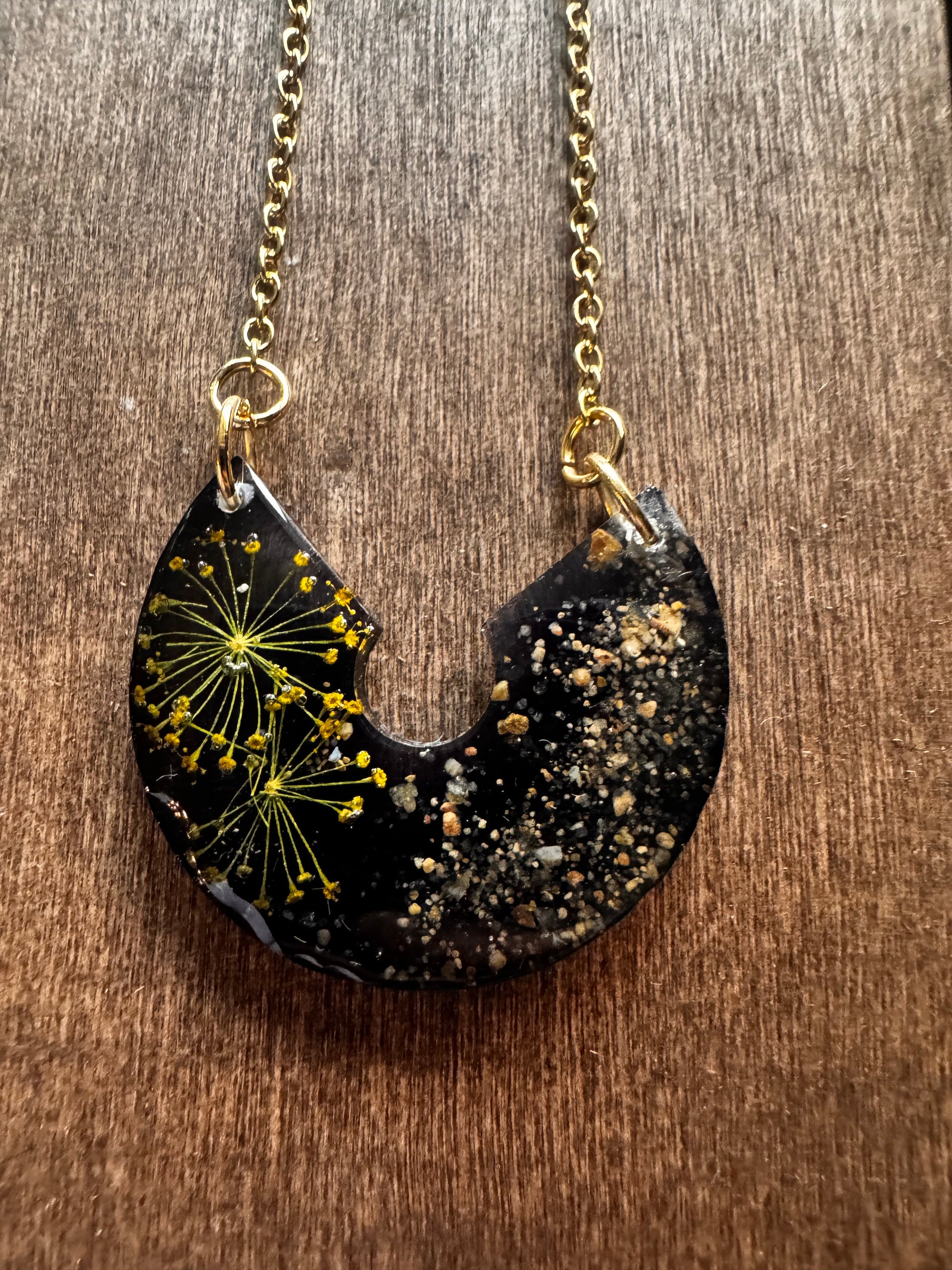 The Missouri River Keepsake Pendant holds a piece of nature’s story within its frame. Made with authentic pebbles and sand gathered from the banks of the Missouri River, with dried dill from the artist's garden, this pendant captures the timeless flow and grounding energy of one of America’s greatest waterways. Each stone and grain is preserved in clear resin, creating a natural mosaic that is both earthy and elegant. A meaningful keepsake for adventurers, nature lovers, or anyone who carries the spirit of the river with them.