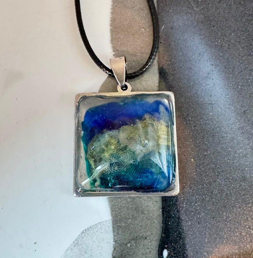 This square-shaped pendant with resin and stainless steel setting, features a mesmerizing mix of blue, green, and lighter gold areas. The colors blend together in a swirled, abstract design, reminiscent of ocean waves. The pendant is attached to a black cord, making it a striking and unique piece of jewelry.