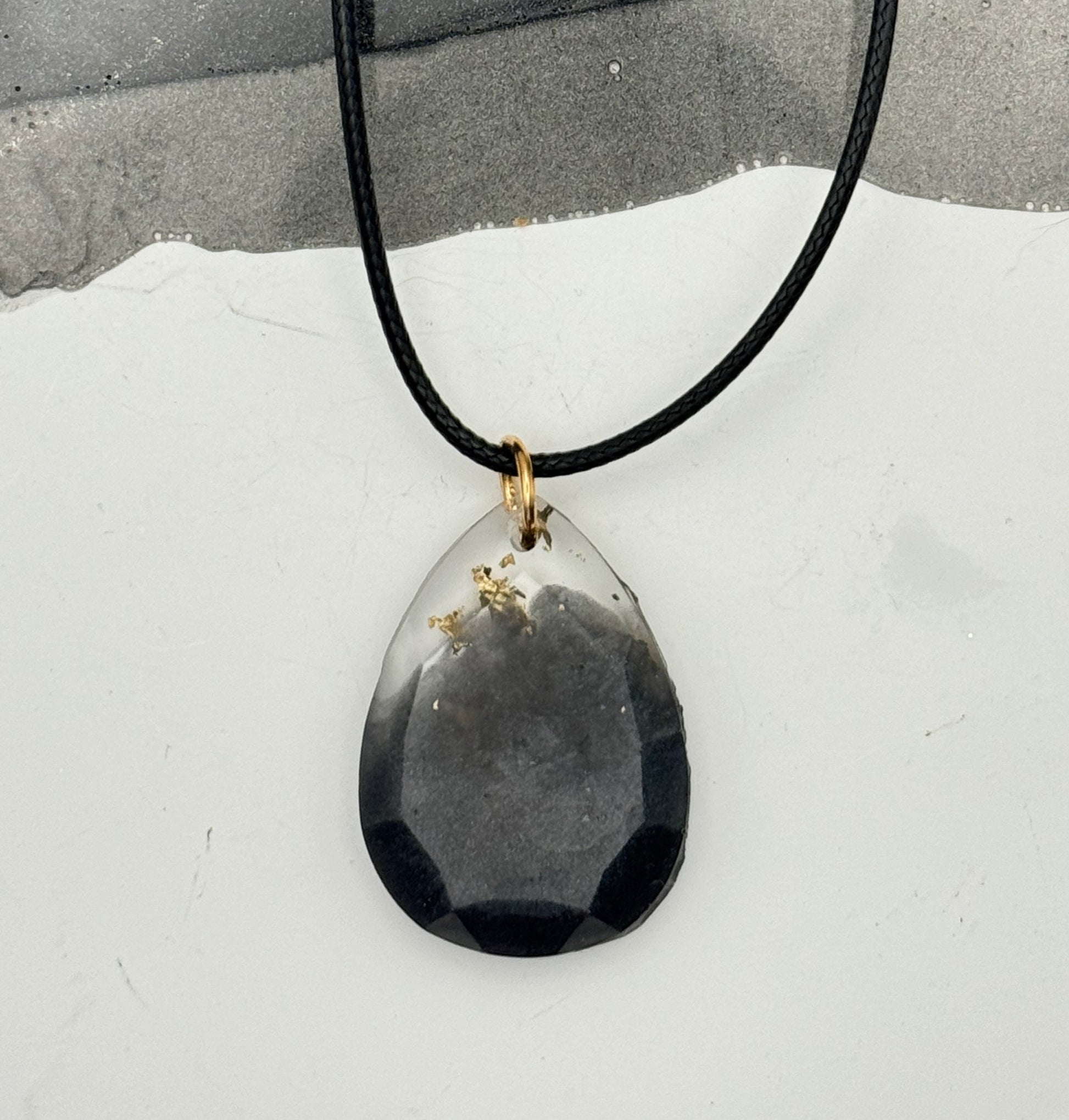 Introducing the teardrop-cut black and gold pendant-a striking geometric piece that combines sleek modern design with organic charm. This teardrop pendant features a gradient from deep charcoal to soft white, accented by a touch of radiant gold leaf. Lightweight and versatile, it hangs from a black cord with a gold-tone loop for added elegance. Perfect for those who love minimalist jewelry with a hint of luxury.