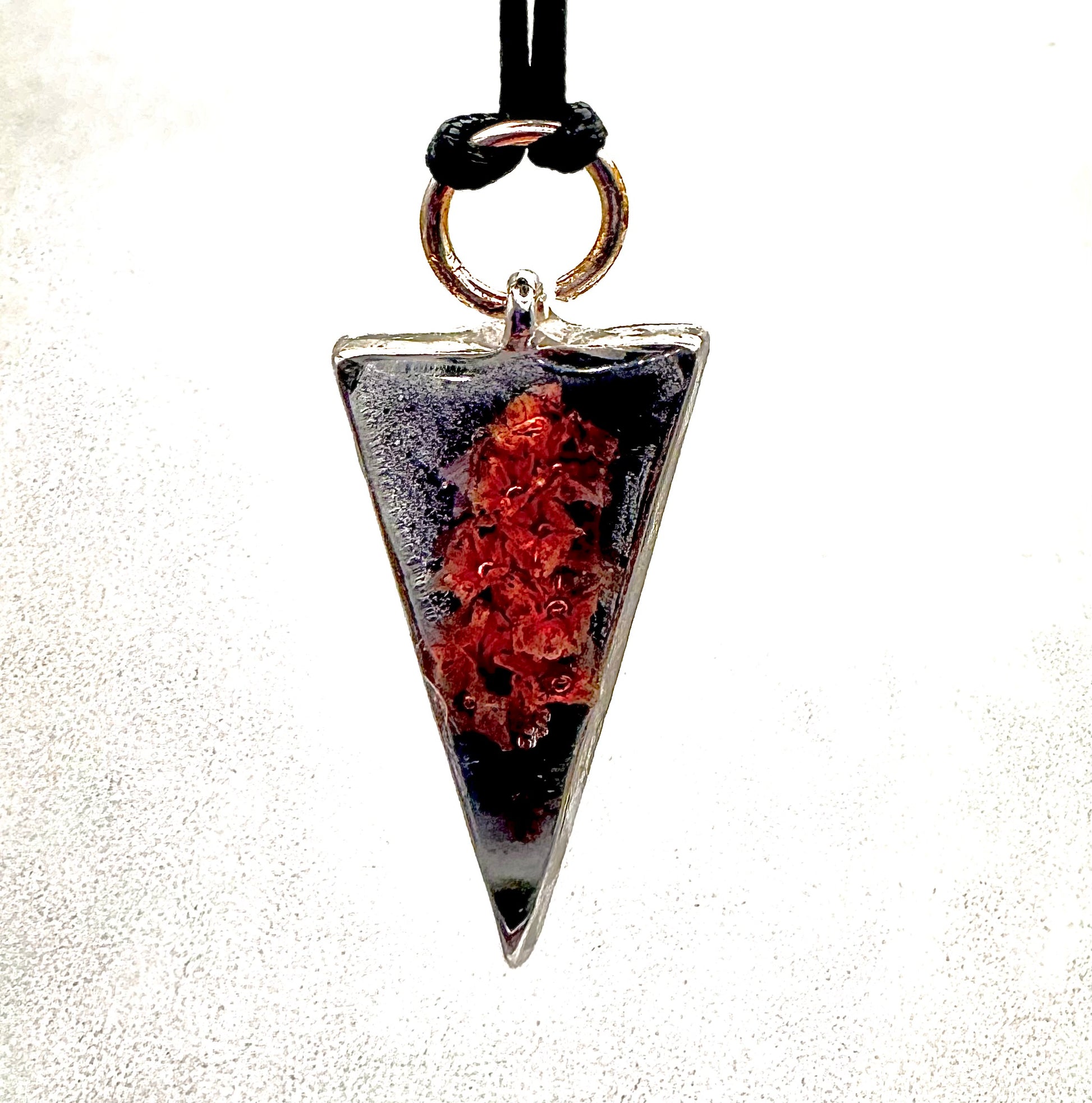 The intricate, organic pattern within the clear resin hosts a cluster of pink wildflowers from KS that have been preserved by the artist.