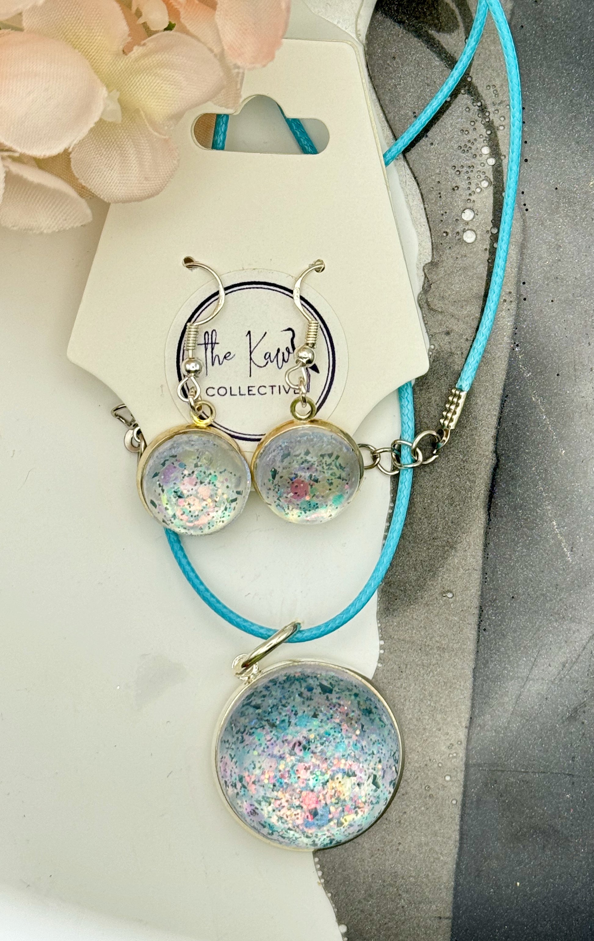 This enchanting jewelry set features shimmering dome-shaped earrings and a matching pendant filled with iridescent pastel flakes, evoking the magic of underwater treasures. The pendant is paired with a vibrant turquoise cord, adding a playful and ocean-inspired touch. Perfect for bringing a whimsical, dreamy vibe to any outfit!