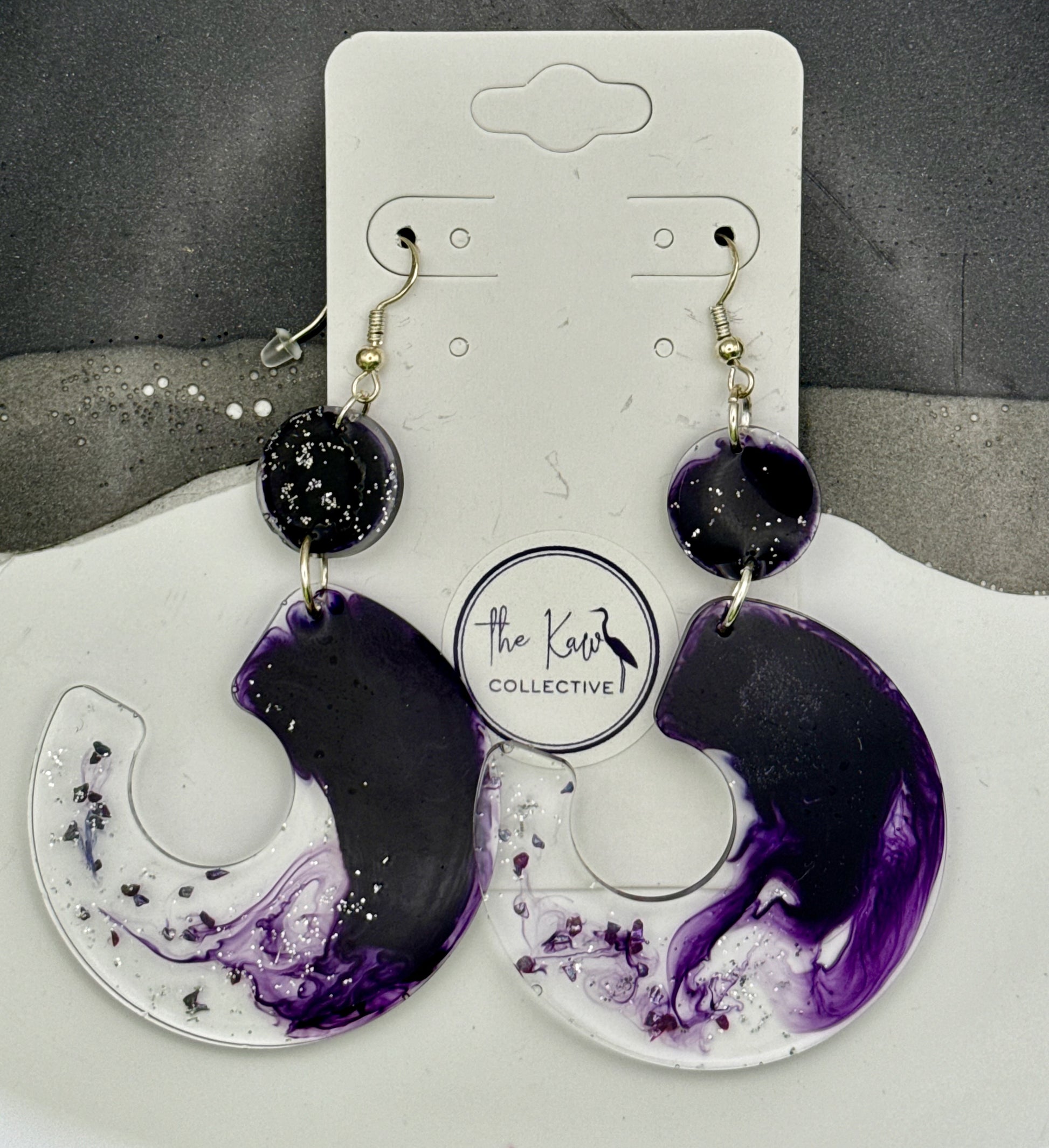 These bold crescent-shaped earrings feature a mesmerizing swirl of deep purple, black, and white with silver speckles that shimmer like stardust. The layered drop design adds dimension and movement, making them the perfect statement piece for fans who love a playful, celestial-inspired take on team pride. Ideal for game day or adding a cosmic twist to any outfit!