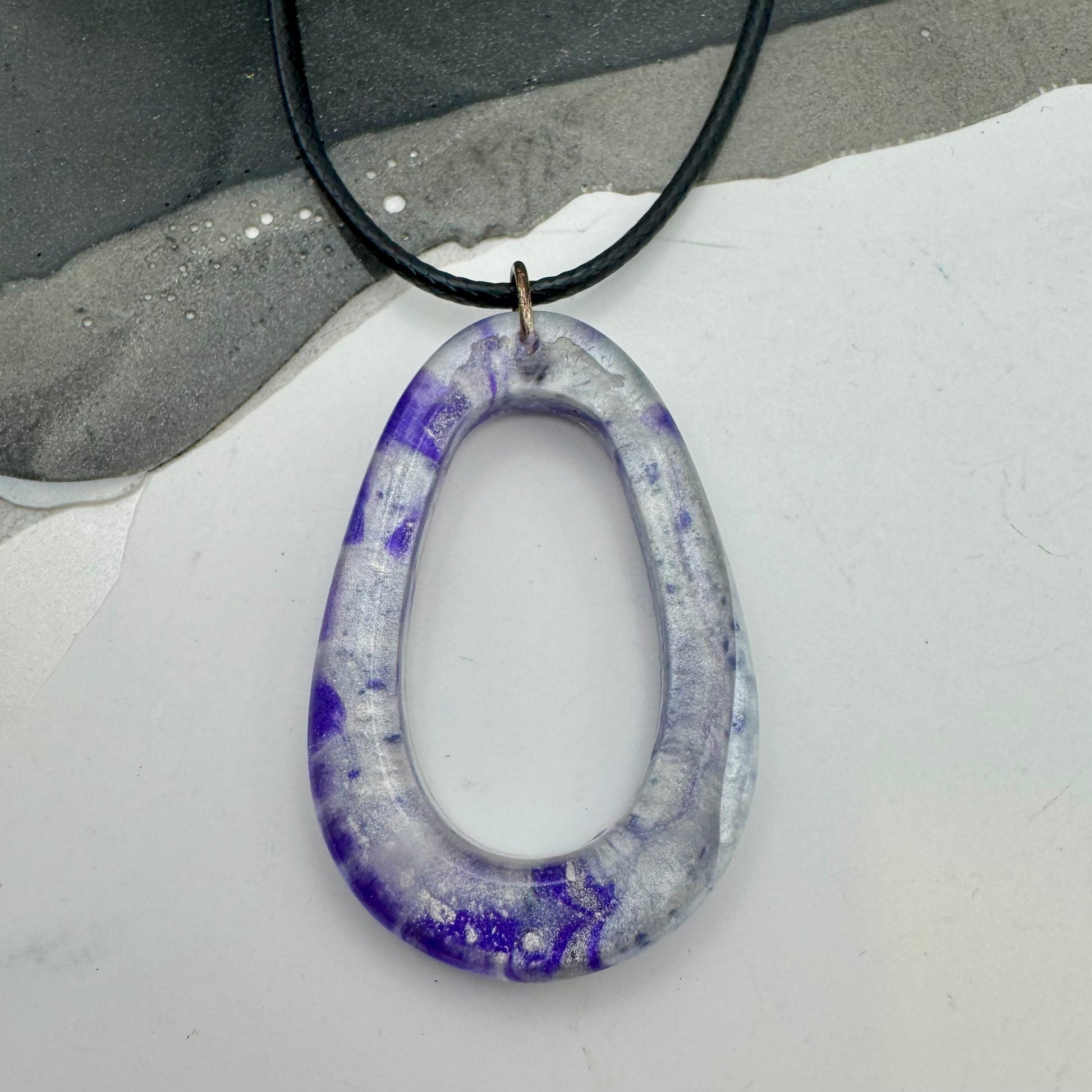 The Violet Dream Pendant from the Dash Collection is an ethereal statement piece, blending celestial tones of silvery mist and vibrant violet swirls. The organic teardrop shape gives it a natural, flowing form, while the marbled effect evokes the beauty of a cosmic nebula drifting through the night sky.
